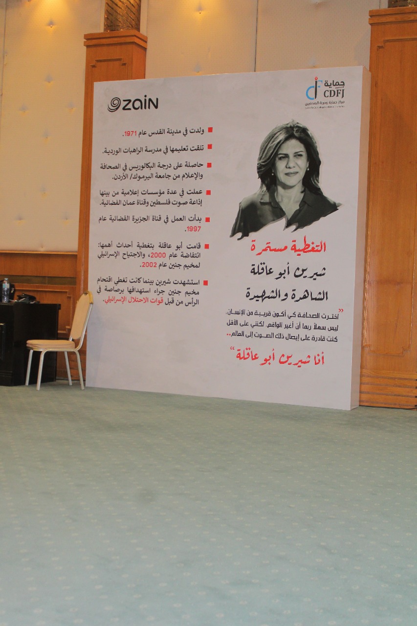 وكان مركز حماية وحرية الصحفيين قد صمم جدارية "التغطية مستمرة" للشهيدة شيرين أبو عاقلة، وضعت عند مدخل قاعة جلسة الاستذكار، كتب عليها الحاضرون والمشاركون كلمات لروح الشهيدة، حيث ستُرسل نسخة عن هذه الجدارية إلى عائلتها، وزملائها، وزميلاتها في فلسطين، وأخرى لشبكة الجزيرة في الدوحة.