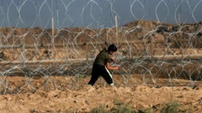 فتى فلسطيني يحاول قطع السياج الشائك عند الخط الفاصل بين قطاع غزة واسرائيل