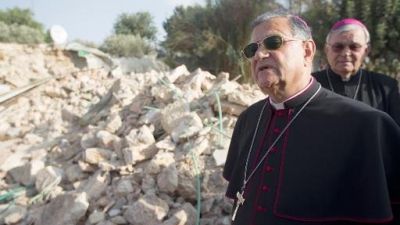 البطريرك فؤاد طوال بين انقاض المنزل الذي هدمته اسرائيل في القدس الثلاثاء