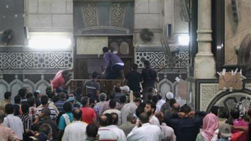 متظاهرون يدعمون الرئيس المصري المخلوع محمد مرسي داخل مسجد الفتح في ميدان رمسيس