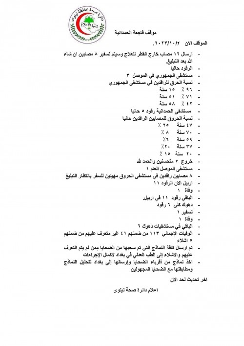 و أعلنت دائرة صحة محافظة نينوى، امس الاثنين، عن حصيلة جديدة لضحايا حريق الحمدانية