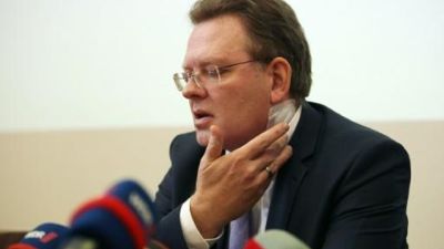 رئيس بلدية التينا اندرياس هولشتين في مؤتمر صحافي في مقر بلديته بعد مغادرته المستشفى للعلاج اثره طعنه في الرقبة