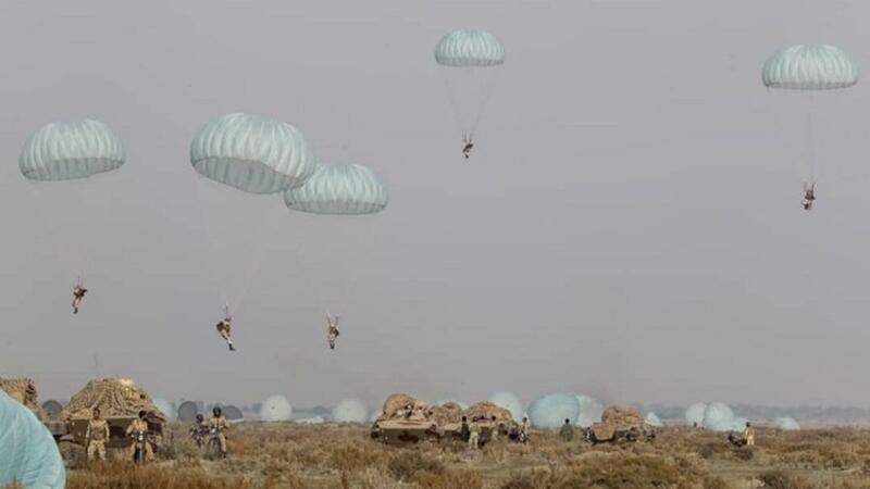 وتابع شرفي شارحاً: "هبطت القوات المحمولة جواً على شكل مئات المظليين، أقلتهم طائرات تابعة للجيش من طراز C-130، في المواقع المحددة خلال عملية مخططة لها مسبقاً"، وذلك بالتزامن مع "إنزال أسلحة ومعدات عسكرية بما فيها الدراجات النارية وقاذفات صواريخ عيار 107 ملم ومدافع عيار 23 ملم، في منطقة المناورات العامة".