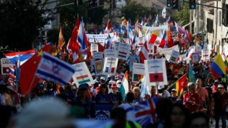 وحمل المشاركون في المسيرة الاعلام وجاؤوا من دول مختلفة من بينها الولايات المتحدة والبرازيل وتايلاند، ويزور العديد منهم القدس ضمن وفود مسيحية.