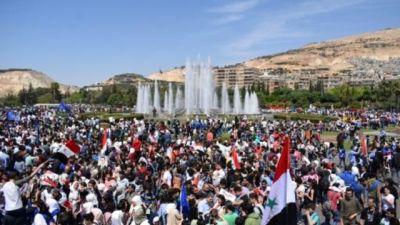 وفي ساحة الأمويين في دمشق، احتشد الآلاف رافعين الاعلام السورية وصور الرئيس السوري بشار الاسد احتفالا "بانتصارات" الجيش وفق ما نقلت وكالة الأنباء السورية الرسمية (سانا)، عشية ذكرى جلاء القوات الفرنسية من البلاد في العام 1946.