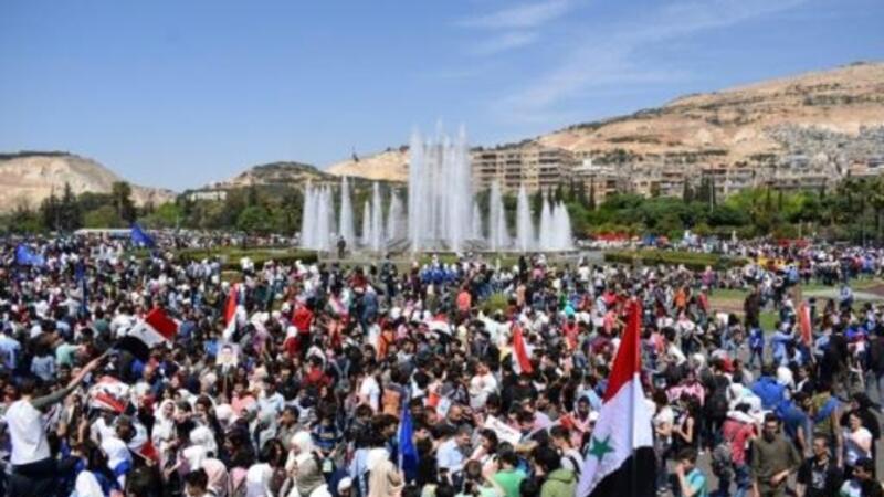 تجمع آلاف السوريين الاثنين في ساحة الأمويين في قلب دمشق احتفالاً بـ"انتصارات" الجيش السوري في الغوطة الشرقية وتنديدا بالضربات الغربية على بلدهم اثر تقارير عن هجوم كيميائي مفترض في مدينة دوما.