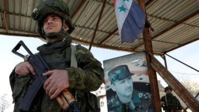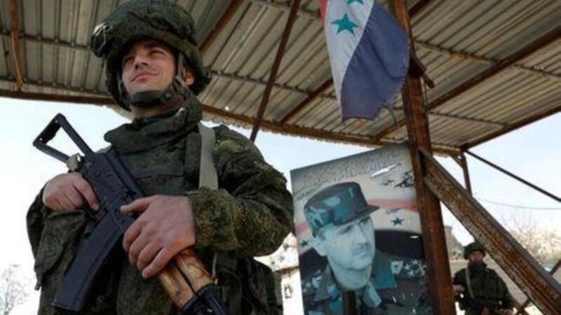 جندي روسي أمام صورة للرئيس السوري بشار الأسد في دمشق