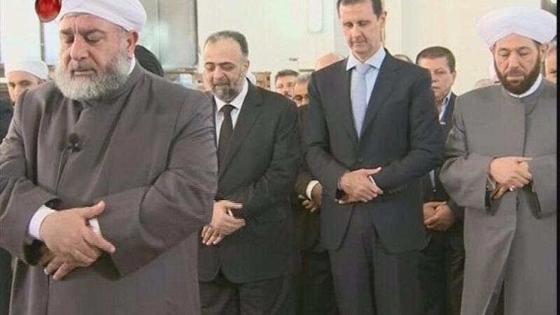 والأسد الذي لا يغادر دمشق ولا يظهر علناً إلا نادراً، أدى الصلاة الى جانب وزير الأوقاف محمد عبد الستار السيد ومفتي سورية احمد بدر الدين حسون.