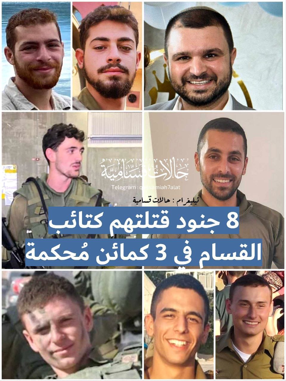 وكشف جيش الاحتلال عن أسماء 8 جنود قتلوا في ثلاثة كمائن منفصلة على يد كتائب القسام هم : اللواء أوهاد عاشور ، الرائد إلياهو أوحانا ، الرائد نداف فرحي ، الرقيب إيتمار شيمن ، الرقيب جال هيرشكو ، الرقيب أوريل باشان ، الرقيب ديفد ، اللواء إليساف شوشان .