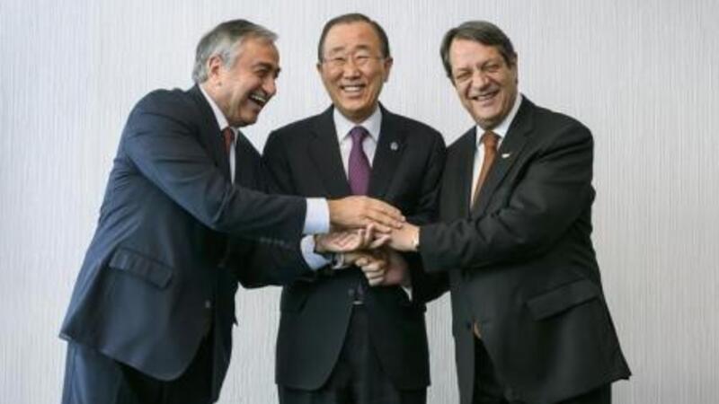 الأمين العام للأمم المتحدة بان جي مون (وسط الصورة يصافح زعيم القبارصة الأتراك مصطفى اكينجي (إلى اليسار) وزعيم القبارصة اليونانيين نيكوس اناستاسيادس خلال محادثات سويسرا بشأن إعادة توحيد جزيرة قبرص