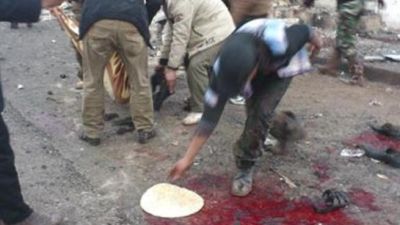 وأظهرت مقاطع مصورة نشرها نشطاء على الإنترنت عشرات الجثث المخضبة بالدماء ملقاة في الشارع بين الأنقاض والشظايا.
