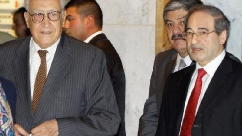 موفد الامم المتحدة وجامعة الدول العربية الخاص الاخضر الابراهيمي (يسار) مع نائب وزير الخارجية السوري فيصل المقداد