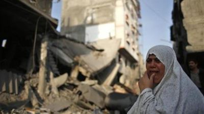 امراة فلسطينية تقف امام منزل مدمر اثر غارة اسرائيلية في غزة