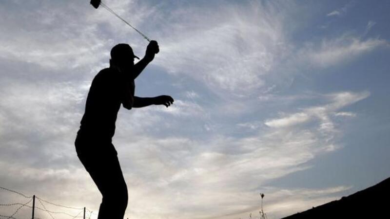 متظاهر فلسطيني يرمي جنود الاحتلال بالحجارة خلال مواجهات في نابلس بالضفة الغربية تضامنا مع غزة/أ.ف.ب