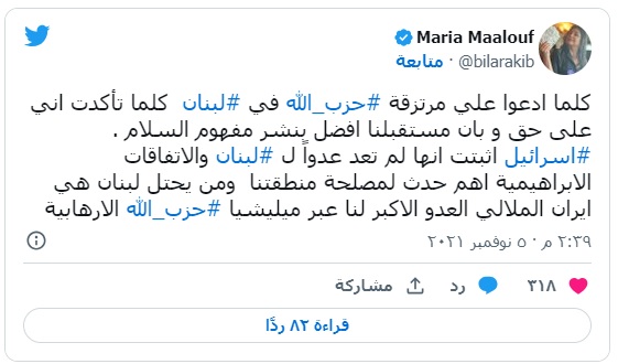 وفي ذلك الوقت، علقت معلوف على الاتهامات قائلة ان اسرائيل ليست عدوا لبلادها، بل هو حزب الله وحليفته ايران اللذين اتهمتهما باحتلال لبنان.