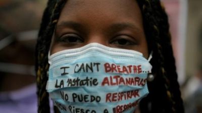وندد المتظاهرون من البيض والسود، بوفاة جورج فلويد، وهو أميركي من أصل أفريقي يبلغ 46 عامًا قضى وهو يقول "لا أستطيع التنفس"، ورددوا "لا سلام بدون عدالة" أو "أنتم العنصريون، من هم الإرهابيون".