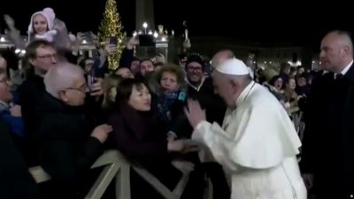 تقدم بابا الفاتيكان فرانسيس الأربعاء باعتذار إلى امرأة مسكت يده بقوة بينما كان يتجول بين محبيه في ميدان القديس بطرس.