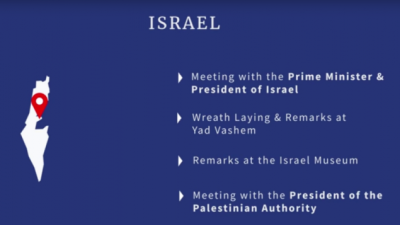 ومن المتوقع أن يلتقي الرئيس الأمريكي خلال هذه الزيارة، التي ستستغرق يوما واحدا فقط، كلا من رئيس الوزراء الإسرائيلي، بنيامين نتنياهو، ورئيس البلاد، رؤفيلين ريبلين.