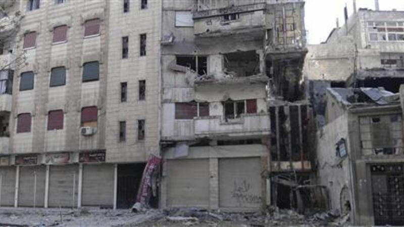 أثار الدمار على مبان في حمص يوم الثلاثاء