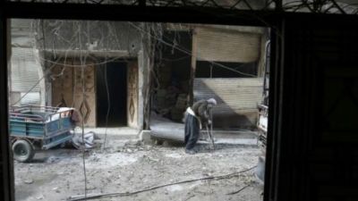 مسن سوري يبحث عن مكان آمن من القصف في بلدة حمورية