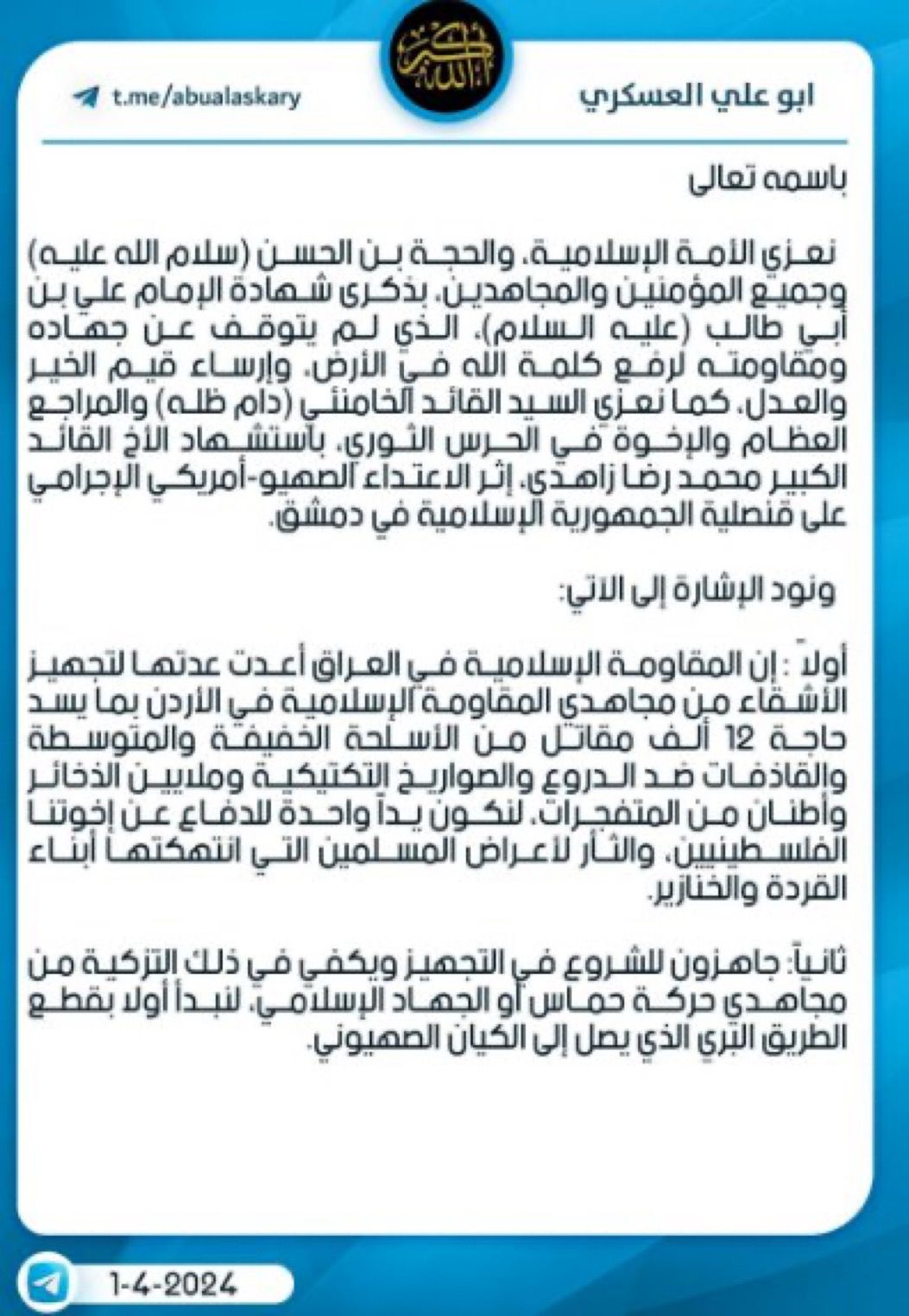 العسكري غرد عبر وسائل التواصل الاجتماعي التابعة له ولاحزاب موالية لايران قال : المقاومة الإسلامية في العراق اعدت عدتها لتجهيز الأشقاء من مجاهدي المقاومة الإسلامية في الأردن بما يسد حاجة 12,000 مقاتل من الأسلحة الخفيفة والمتوسطة والقاذفات ضد الدروع والصواريخ التكتيكية ولايين الذخائر واطنان من المتفجرات لنكون يد واحدة في الدفاع عن اخوتنا الفلسطينيين والثأر لاعراض المسلمين