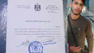 إذ انتشرت صورة لوثيقة قيل إنها صادرة عن محكمة الجنايات في النجف، تظهر الحكم بالإعدام على الشاب مجد بتهمة الإرهاب.