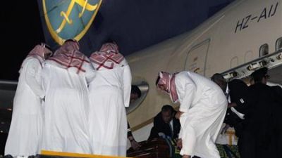 وتجمع مئات من كبار الشخصيات وفي مقدمتهم الملك عبد الله على مدرج المطار اثناء انزال نعش الفقيد من الطائرة الي سيارة اسعاف.