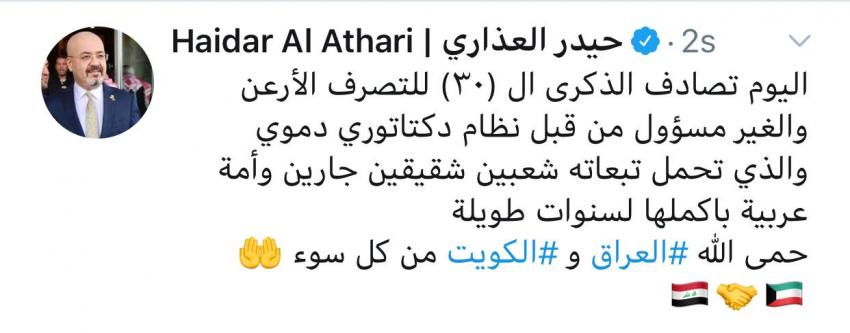 وقال العذاري في تغريدة له عبر تويتر، "اليوم يصادف الذكرى الـ 30 للتصرف الارعن وغير المسؤول من قبل نظام دكتاتوري دموي والذي تحمل تبعاته شعبين شقيقين جارين وأمة عربية بأكملها لسنوات طويلة".
