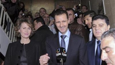 وادلى الرئيس السوري بشار الاسد وزوجته اسماء بصوتيهما في مركز اقتراع داخل مبنى هيئة الاذاعة والتلفزيون الرسمية في دمشق حيث استقبلهما حشد من الموظفين والانصار.