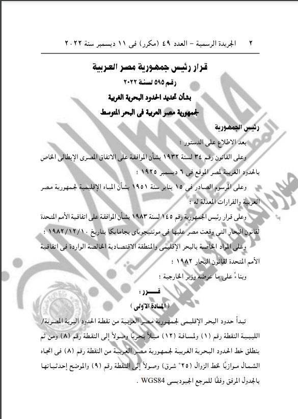 حدد الرئيس المصري عبدالفتاح السيسي، الحدود البحرية الغربية لجمهورية مصر العربية في البحر المتوسط المحاذية لـ ليبيا وذلك في قرار جمهوري حمل الرقم ٥٩٥ لسنة ٢٠٢٢، فيما اعلن عن تاهب عسكري مصري لمهام محتملة في باب المندب