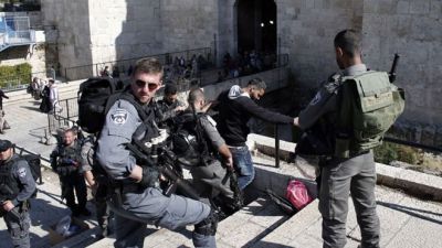ويتجمع المئات من الفلسطينيين عند مخرج الباب، ويصرون على دخول المسجد الأقصى من خلاله.