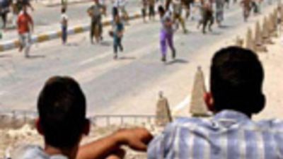 ورفع أفراد الشرطة دروعا من البلاستيك بينما رشقهم المحتجون بالحجارة. ووقف أفراد مسلحون من الشرطة على سطح مبنى البلدية.