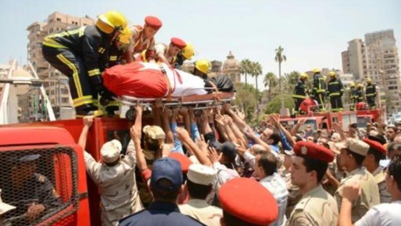 رجال شرطة وإطفاء ينزلون جثمان جندي قتل في شمال سيناء في اعتداء نفذه تنظيم الدولة الإسلامية، خلال تشييعه في المنصورة
