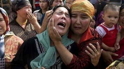 ارشيف/ نساء مسلمات ينتحبن اثر مقتل 15 شخصا في هجوم بالقنابل والسكاكين في منطقة شينجيانغ عام 2014