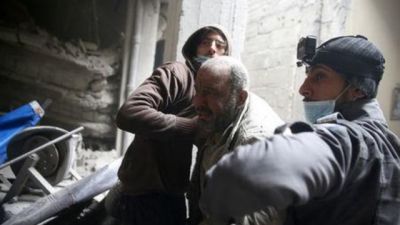 وفي مدينة دوما، شاهد مراسل فرانس برس متطوعين من الدفاع المدني يخرجون نساء جريحات من تحت الأنقاض. واثناء انهماكهم بانقاذ امرأة، استهدف القصف الجوي المنطقة، وتمكنوا من اخراجها لاحقا لكنها كانت فارقت الحياة.