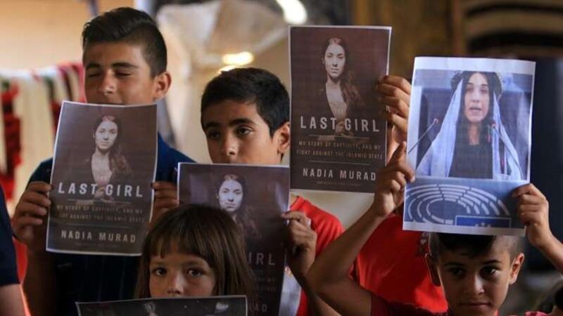 أطفال ايزيديون يحملون صور نادية مراد، التي فازت بجائزة نوبل للسلام