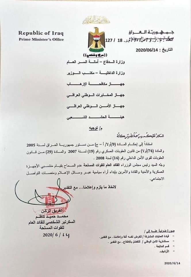 وأظهرت وثيقة بتوقيع السكرتير العسكري للكاظمي، توجيهه بمنع منتسبي الأجهزة العسكرية والامنية والقادة والآمرين من ابداء آراء سياسية عبر وسائل الإعلام ومواقع التواصل الاجتماعي.