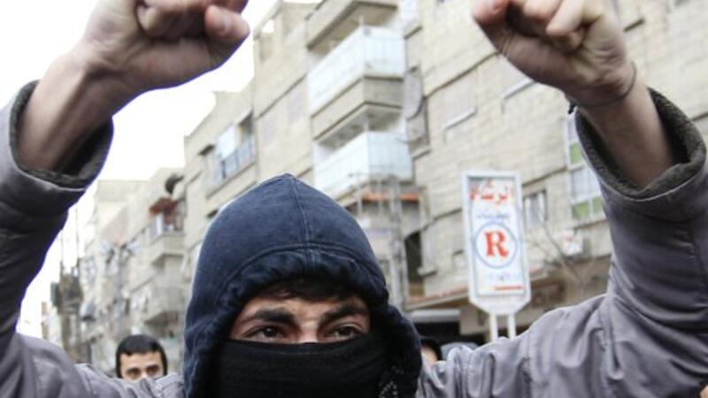 متظاهر ملثم يهتف بشعارات مناهضة للاسد خلال مسيرة احتجاجية في بلدة سقبا بريف دمشق