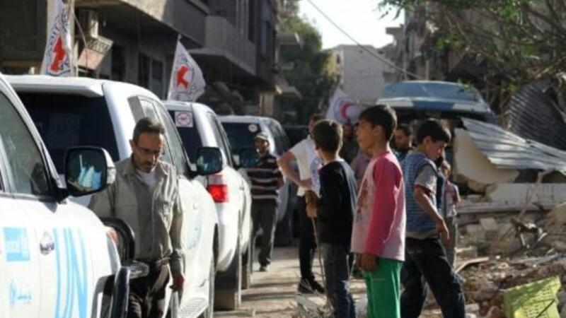 قافلة مساعدات للصليب الاحمر الدولي والهلال الاحمر السوري والامم المتحدة بعيد دخولها الى داريا المحاصرة جنوب غرب العاصمة السورية دمشق