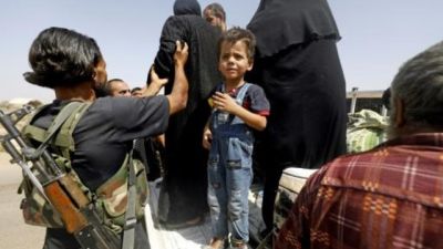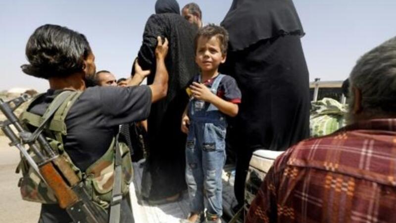 نازحون سوريون من الرقة يصلون إلى قرية حاوي الهوى على بعد أقل من كيلومترين خارج المدينة