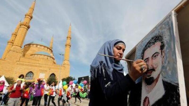 انية ترسم صورة لرئيس الوزراء سعد الحريري في بيروت