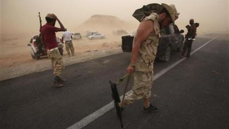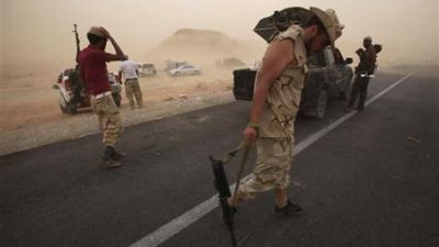 مقاتلون ليبيون من المجلس الوطني الانتقالي عند نقطة تفتيش شمالي بني وليد
