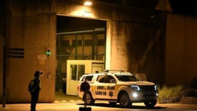 دركي فرنسي يقف بالقرب من سيارة تابعة لدائرة الخدمات الطبية الطارئة "سامو" أمام سجن إنزيسايم في شرق فرنسا