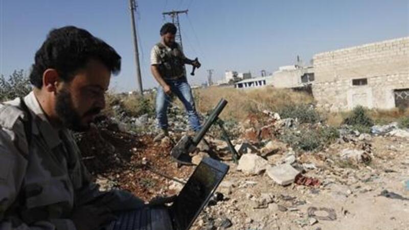 مقاتل من الجيش السوري الحر المعارض يستخدم كمبيوتر محمول واخر يستعد لاطلاق قذيفة مورتر قرب مطار عسكري تسخدمه قوات الرئيس السوري بشار الاسد في حلب