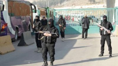 مقاتلون من جيش الفتح يخفرون منطقة خلال اجلاء بالحافلات مقاتلين ومدنيين من بلدتي الفوعة وكفريا الشيعيتين في ادلب