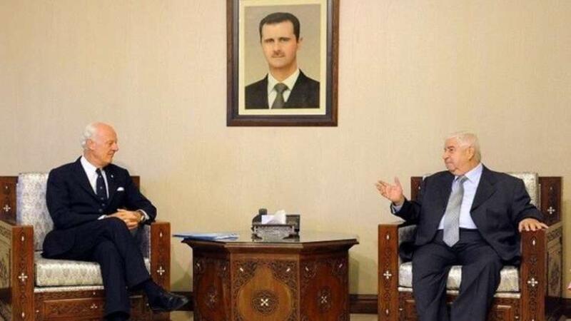 وأفادت وكالة "سانا" بأن المعلم ودي ميستورا بحثا الجهود الرامية بغية إحراز تقدم في المسار السياسي للأزمة السورية واستعرضا الأفكار المتعلقة بالعملية السياسية ولجنة مناقشة الدستور.