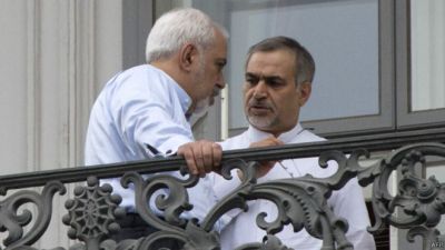 ظريف يتحدث إلى نائبه حسين فريدون، في شرفة الفندق الذي تجرى فيه المفاوضات