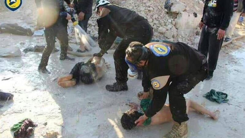 وتداول نشطاء في شمال سوريا صورا على وسائل التواصل الاجتماعي توضح من قالت إنه ضحية تخرج من فمه رغاوي ولرجال إنقاذ يرشون أطفالا شبه عراة بالمياه وهم يتلوون على الأرض.