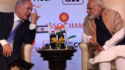 رئيس الوزراء الهندي على (يمين الصورة) مع نظيره الإسرائيلي خلال القمة الإقتصادية الهندية-الإسرائيلية المشتركة في نيودلهي، يناير 2018م. وكالة الصحافة الفرنسية
