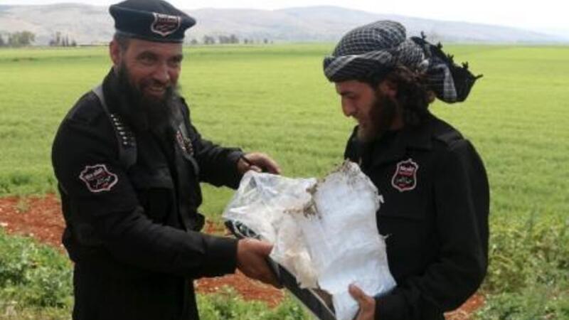شرطيان من جبهة النصرة يعملان ضمن جماعة تسمى جيش الفتح. بحملان بقايا عبوة ناسفة عثر عليها على أطراف طريق يربط إدلب بمنطقة أرمناز في سوريا